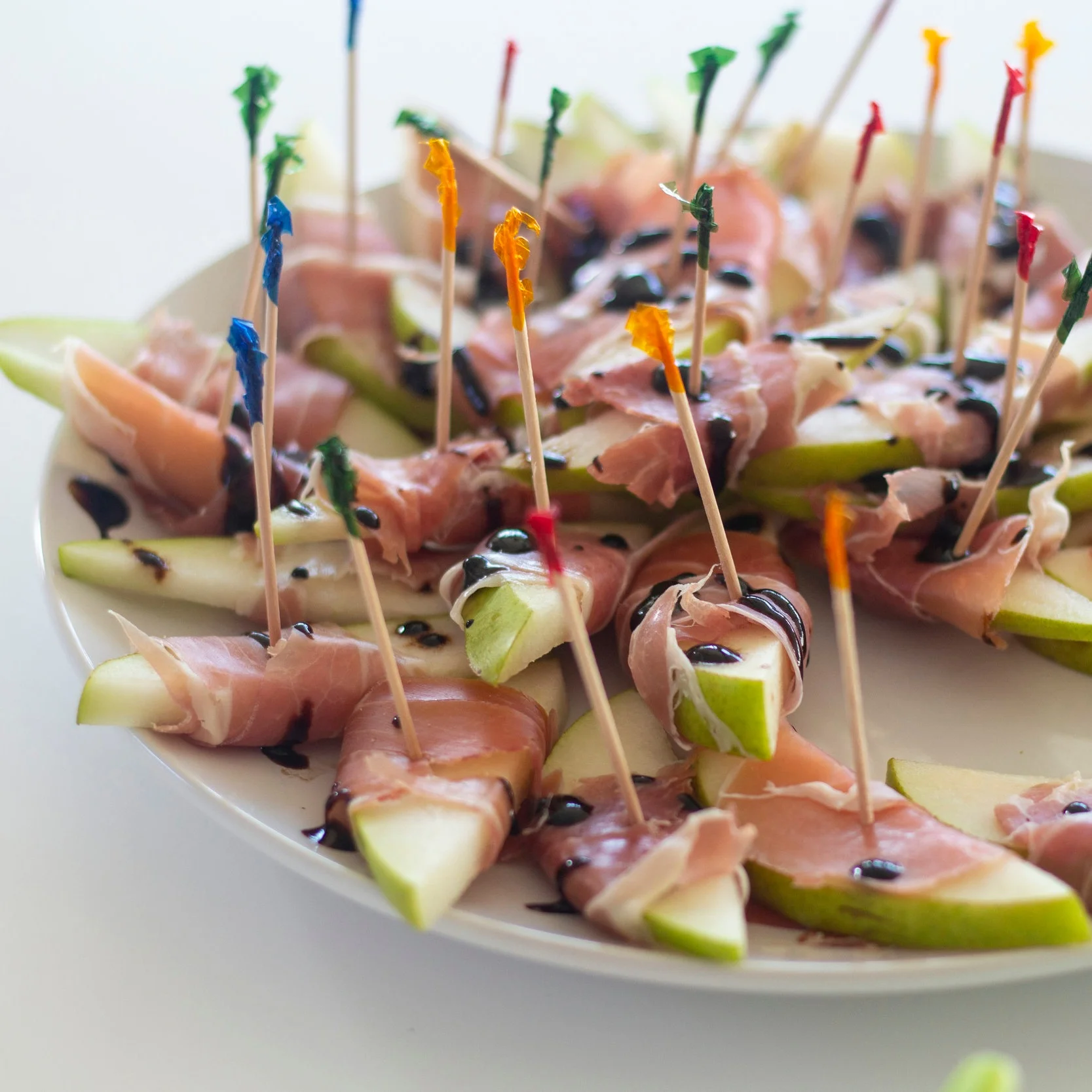 Wrap each pear slice with desired amount of prosciutto and secure with a toothpick